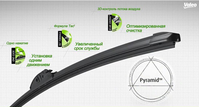 Щетка Valeo FirstПервым представителем новой линейки, выпускаемой по технологии Pyramid™, является щетка Valeo First. Специальный материал щетки изготавливается по технологии Tec2, что гарантирует хороший контакт со стеклом и наилучшую очистку его даже от самых мелких загрязнений. Цифра «2» в обозначении указывает на использование двух материалов: щетка имеет износостойкое покрытие, что позволяет сочетать эластичность с долговечностью. Кстати, эти показатели производитель подтвердил тестовыми испытаниями, которые эквивалентны нескольким сезонам эксплуатации щеток.