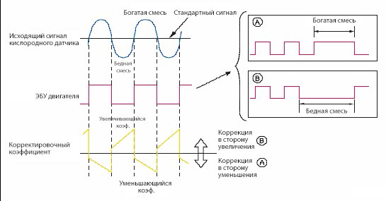 O: Соотношение «воздух-топливо» крайне важно, поскольку влияет на эффективность работы каталитического нейтрализатора, который снижает содержание оксида углерода (CO), несгоревших углеводородов (CH) и оксида азота (NOx) в выхлопных газах. Для его эффективной работы необходимо наличие определенного количества кислорода в выхлопных газах. Датчик «воздух-топливо» (A/F sensor) определяет точное соотношение «воздух-топливо» в смеси, поступающей в двигатель, передавая в ЭБУ изменение сигнала напряжения, который меняется в соответствии с содержанием кислорода в смеси: высокий (бедная смесь) или низкий (богатая смесь). ЭБУ реагирует на сигнал и изменяет состав топливовоздушной смеси, поступающей в двигатель. Когда смесь слишком богатая, впрыск топлива уменьшается.