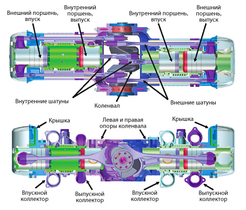 Изюминка новинки в том, что все поршни в ней соединены с единственным центральным коленвалом, в то время как раньше схожие конструкции требовали двух коленчатых валов по краям движка.