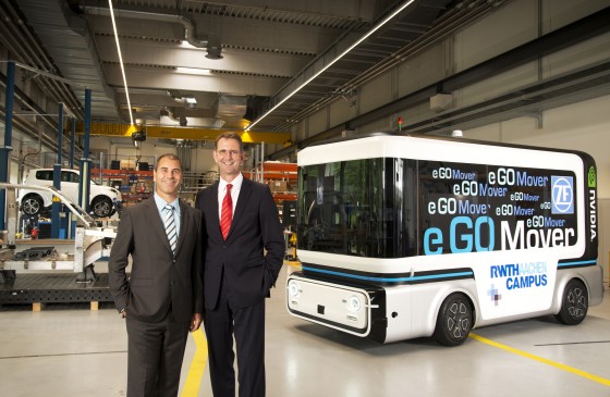 Проф. Гюнтер Шу (справа), генеральный директор e.GO Mobile AG, и Торстен Голлевски (слева), руководитель отдела перспективного проектирования концерна ZF и дочерней инвестиционной компании Zukunft Ventures GmbH, представляют автомобиль для транспортировки людей и грузов. Беспилотный автомобиль будет разработан на основе совместного предприятия ZF and e.GO e.GO Moove.