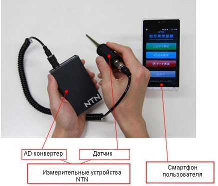 В комплект диагностического оборудования NTN входит вибрационный датчик (Dвнутр.=24 мм, l=50 мм) и компактный конвертор (100х60х20). Принцип работы очень прост: необходимо загрузить на смартфон специальное приложение с сервера NTN, используя определенный ID и пароль. Далее следует выполнить измерения, а прибор сам осуществит отправку на сервер данных, где с помощью метода быстрого преобразования Фурье анализируется поступающий сигнал, что позволит определить качество работы подшипника и его пригодность. При наличии неисправности идентифицируется район возникновения проблемы. Все процессы калькуляции и анализа модернизируются на сервере, что гарантирует использование в аналитическом процессе новейшего программного обеспечения. Для корректной работы приложения необходим смартфон с подключением к интернету, работающий под управлением ОС Android и протокол Bluetooth. Результаты выполненных измерений сохраняются на сервере, что позволяет при необходимости сформировать выборку из статистических данных и отобразить ее в виде графика. Сейчас рядом компаний проводится тестирование сервиса, а начало официального распространения и использования запланировано на середину текущего года.