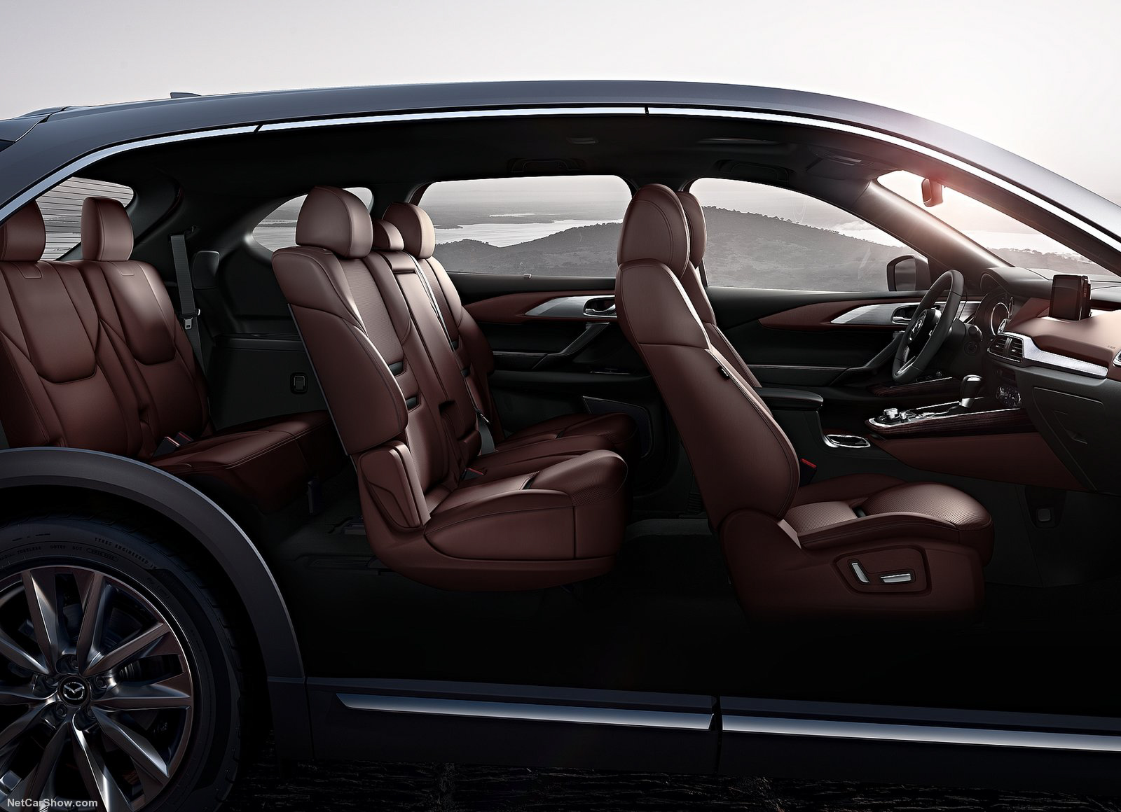 Внутри CX-9 ощущается крупнее, чем предполагает его внешность, а передний и средний ряды легко вмещают крупных пассажиров. В третьем ряду достаточно места, чтобы предотвратить клаустрофобию, но низкая подушка и узкий запас по высоте делают его наилучшим образом подходящим для детей и невысоких взрослых.